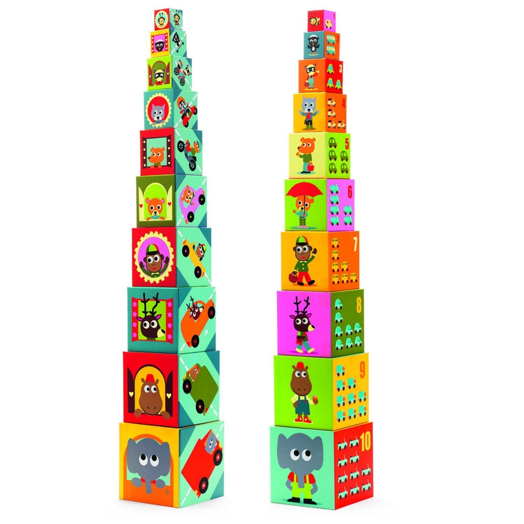 Un ensemble de cubes de différentes tailles et couleurs qui peuvent être placés les uns sur les autres ou empilés les uns dans les autres. Les cubes pyramidaux sont fabriqués en carton épais de haute qualité, ils sont légers et sans danger pour les petits enfants.