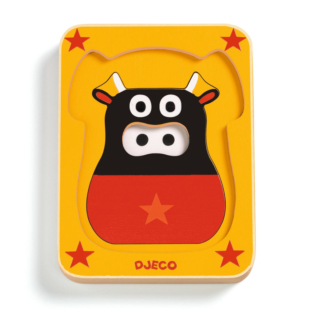 Les pièces du puzzle sont empilées sur trois niveaux. Après avoir retiré la partie supérieure, l'enfant découvrira que la valise de l'éléphant est le pantalon de la vache, que la tête de la vache devient les yeux d'une chouette, etc.