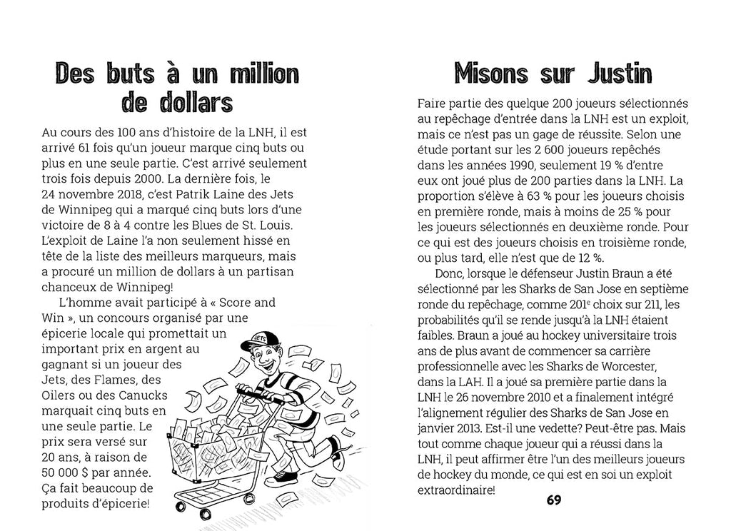 Savez-vous quel match de la LNH a duré le plus longtemps? Quel est le plus jeune joueur de la LNH à mettre la rondelle dans le filet à ce jour? Et qui était le plus vieux joueur à participer aux Jeux olympiques? L'expert Eric Zweig marque des points avec un autre ouvrage rempli d'infos, d'histoires et de faits amusants sur le hockey. Découvrez le comptable qui a joué un seul soir dans la LNH (et a gagné!), les débuts fulgurants de la mascotte Gritty et ce que le crottin de cheval et la technologie DEL ont en commun. Apprenez-en plus sur les ligues, comme celle dans laquelle jouent les Swamp Rabbits et celle dans laquelle Wayne Gretzky a commencé en tant que professionnel (indice : ce n'est pas la LNH!). Toute cette info est dans le livre avec les dernières statistiques, des photos et des bandes dessinées.