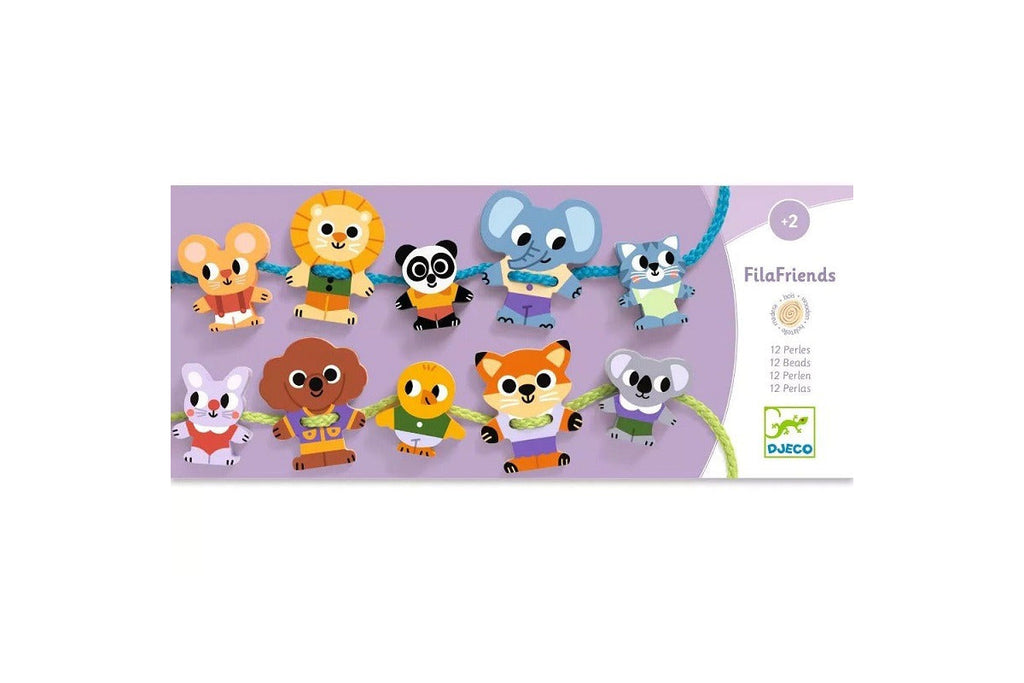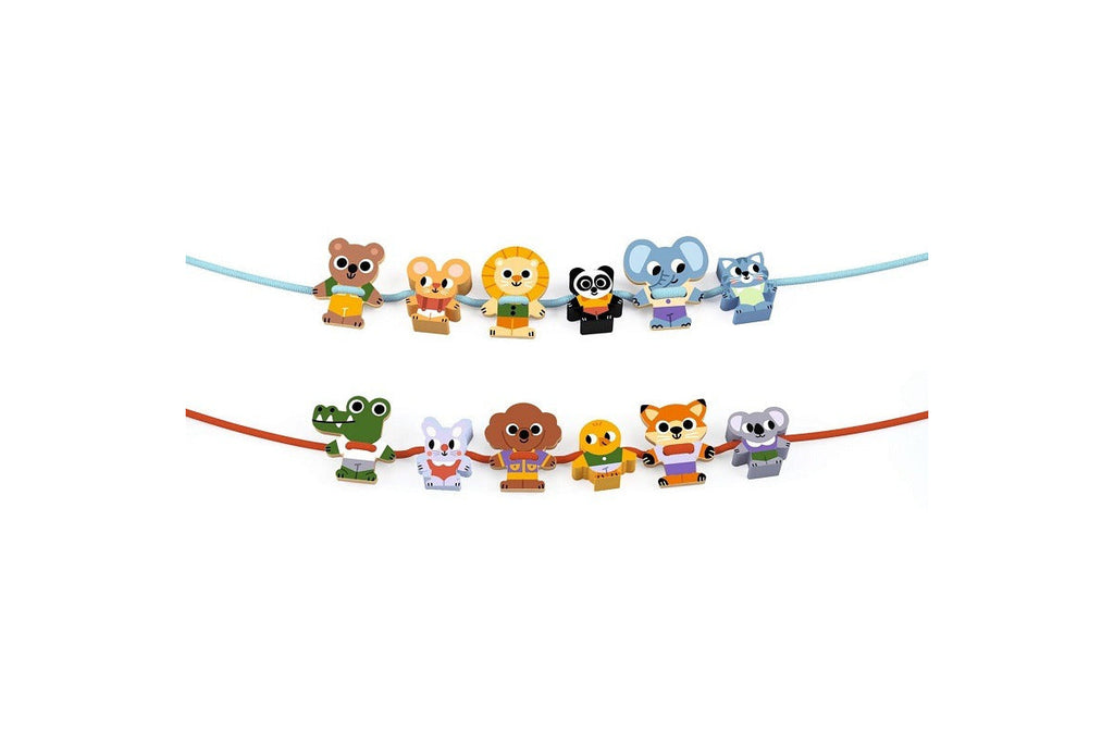 Un excellent jouet pour pratiquer la motricité fine. En enfilant des animaux sur une ficelle, un enfant peut inventer des histoires sur ces personnages. L'ensemble comprend : 12 figurines en bois et 2 ficelles.