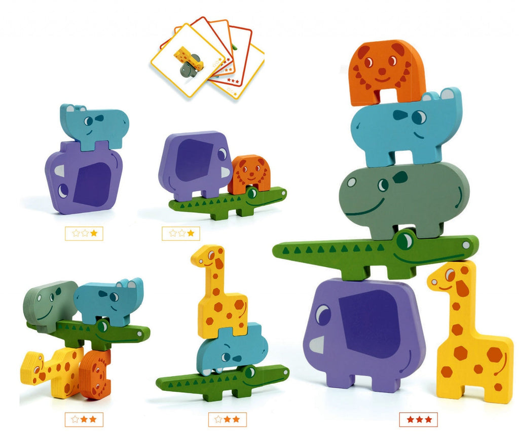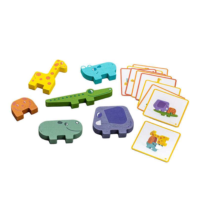 L'ensemble contient : 20 cartes avec des tâches de différents niveaux de difficulté, 6 figurines d'animaux en bois pour construire des pyramides