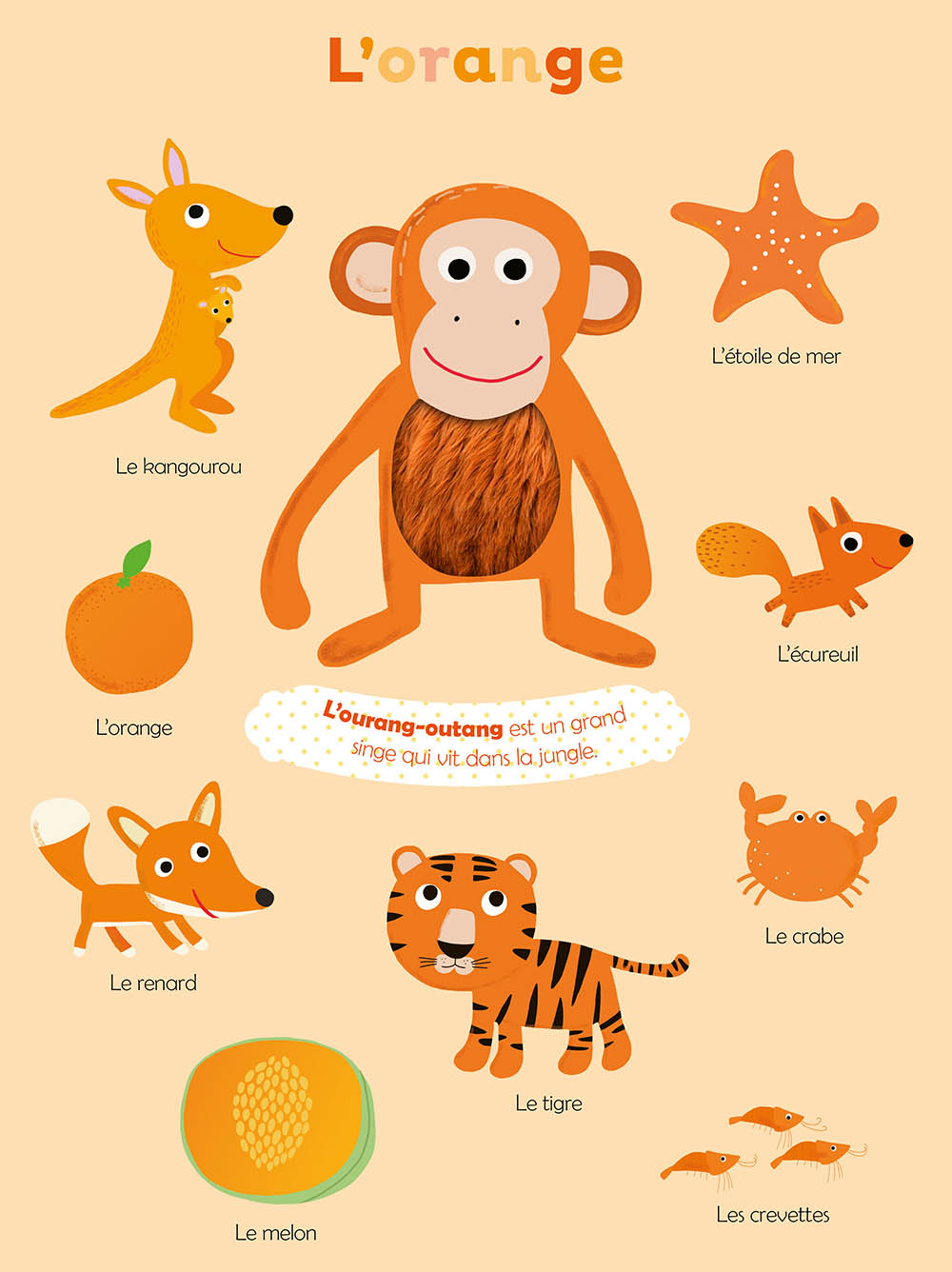 L'enfant découvre ses premières couleurs tout en douceur, grâce à des univers simples et adaptés. À chaque page, le tout-petit peut toucher un bel élément et en nommer de nombreux autres.