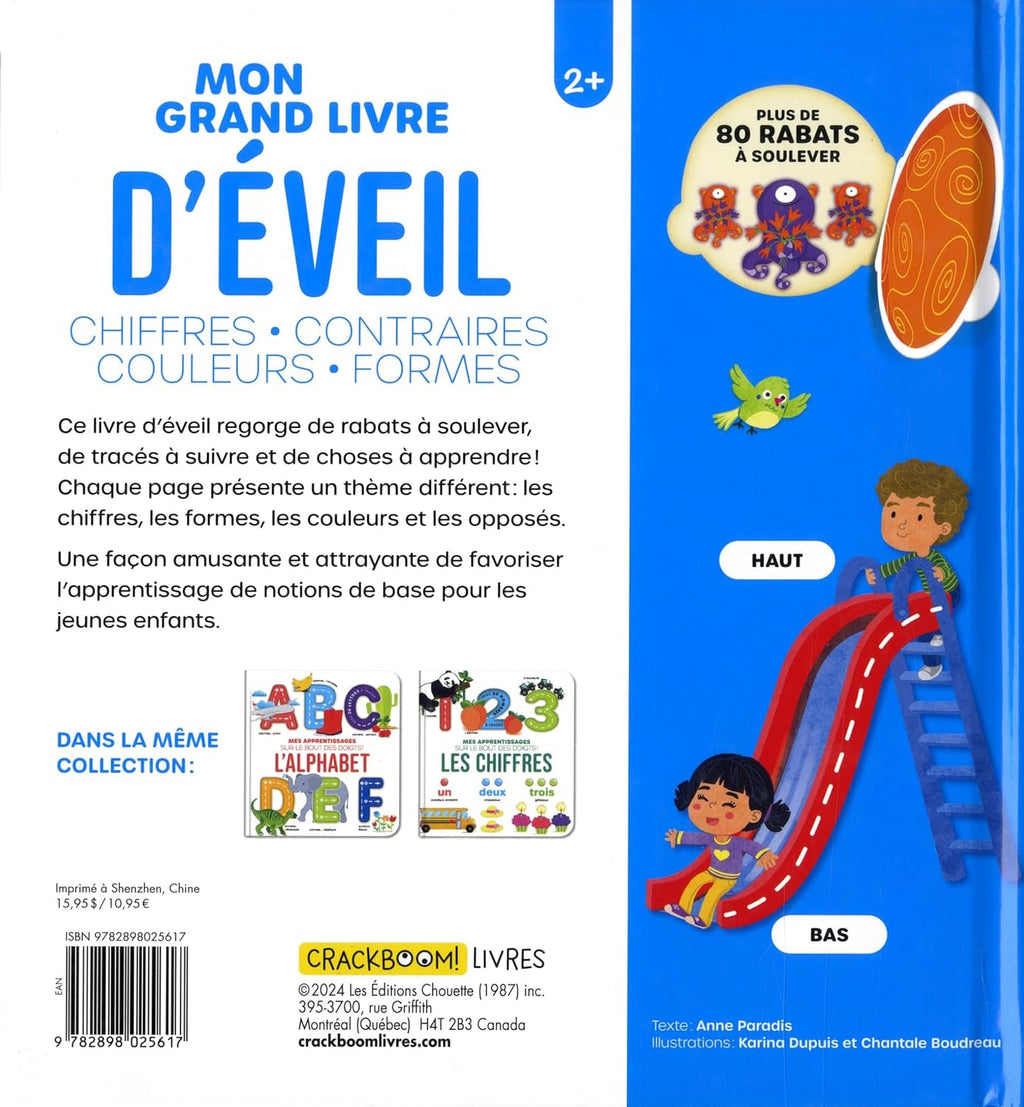 Ce livre d’éveil regorge de rabats à soulever, de tracés à suivre et de choses à apprendre! Il permet de travailler les habiletés de pré-écriture des tout-petits tout en les aidant à développer leur vocabulaire. Chaque page interactive présente un concept de base différent : les chiffres, les formes, les couleurs et les opposés. Les rabats et les tracés sont une façon amusante et attrayante de favoriser l’apprentissage précoce aux jeunes enfants.