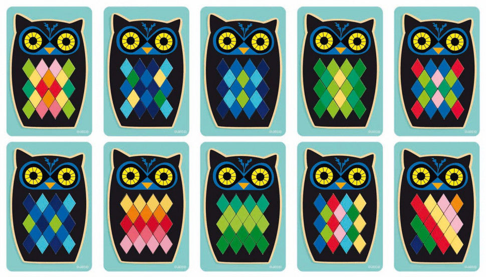 Dans le coffret, l'enfant trouvera un socle en forme de chouette en bois avec un espace vide au centre, ainsi que de nombreux diamants multicolores avec lesquels il devra remplir la chouette selon les fiches de tâches. L'enfant peut suivre les instructions et les exemples avec des tâches ou remplir la chouette au gré de son imagination.