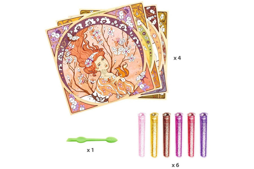 Initiez les enfants au style Art Nouveau lumineux et sophistiqué en les invitant à ajouter des paillettes aux images créées à partir des peintures d'Alphonse Mucha. Pour ce faire, vous devez retirer la couche supérieure de l'image et verser délicatement les paillettes sur la base adhésive.