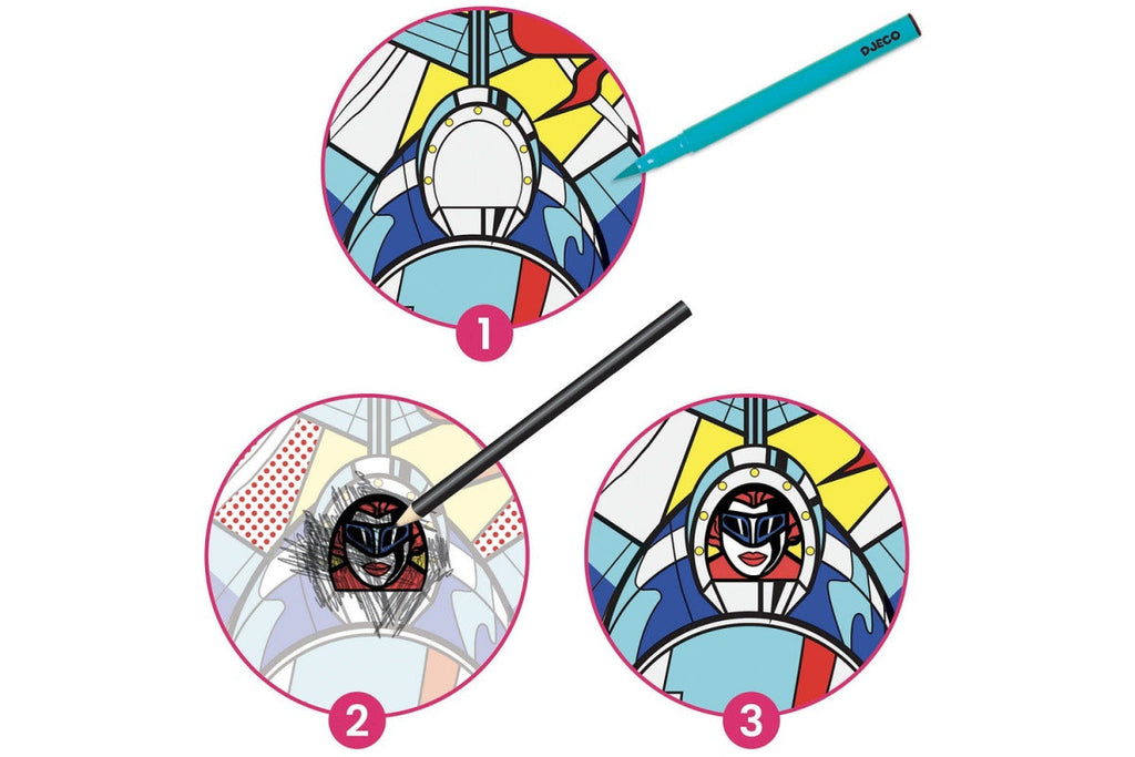Le coffret contient : 4 socles (20x20 cm), 4 feuilles avec transferts, 4 feutres, crayon, instructions couleur pas à pas.