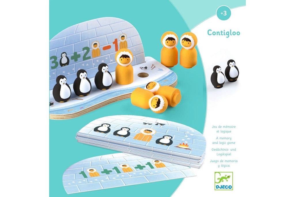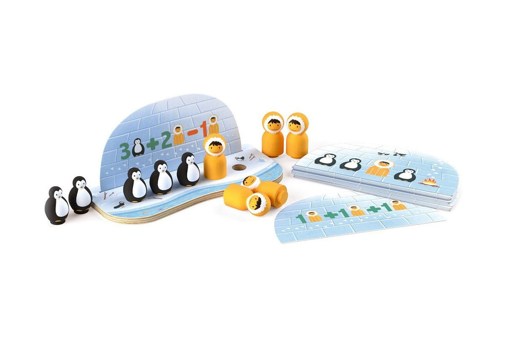 Ce jeu apprendra aux enfants à compter jusqu'à 5. Nous compterons les pingouins et les hommes. Il suffit de sortir du paquet une carte présentant un problème (elle a la forme d'un igloo), de la placer sur un support et, à l'aide des figures, d'essayer de résoudre l'exemple écrit dessus. La réponse se trouve au dos de la carte. L'ensemble comprend : 1 support, 10 figurines, 20 cartes.