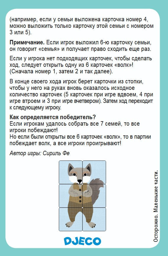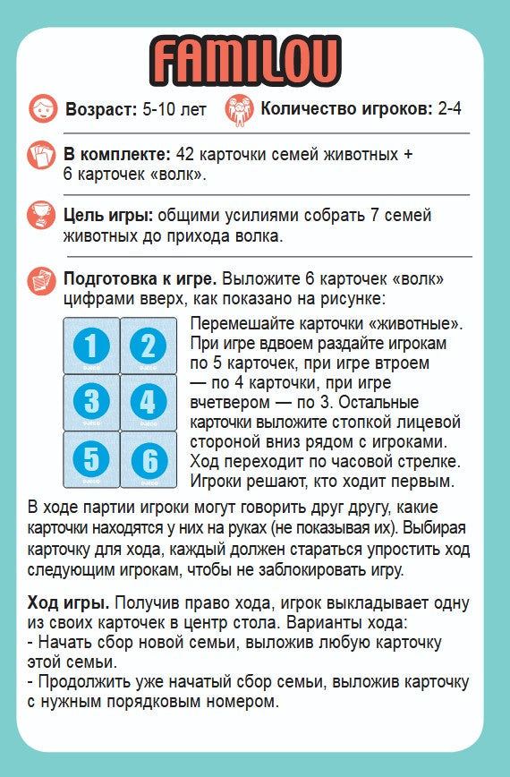 Dans ce jeu coopératif, les joueurs doivent s’entraider et jouer de manière stratégique pour faciliter les tours suivants. Ils peuvent se dire quelles cartes ils ont en main (sans les montrer), et doivent collaborer pour compléter toutes les familles. Si les 7 familles sont réunies, tout le monde gagne ! Mais si les 6 cartes « loup » sont retournées avant… c’est le loup qui l’emporte !