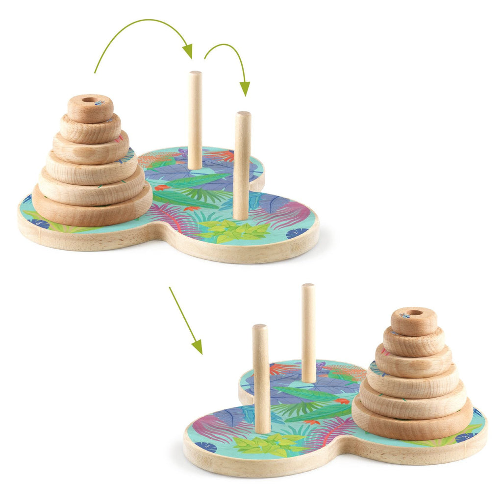 Ce jeu consiste à déplacer les 6 disques colorés d'un piquet à un autre, en respectant des règles précises : un seul disque peut être déplacé à la fois et un disque plus grand ne peut jamais être placé sur un plus petit. L'objectif est de transférer tous les disques sur le dernier piquet dans le bon ordre. Une solution parmi les centaines possibles est fournie dans le livret inclus.