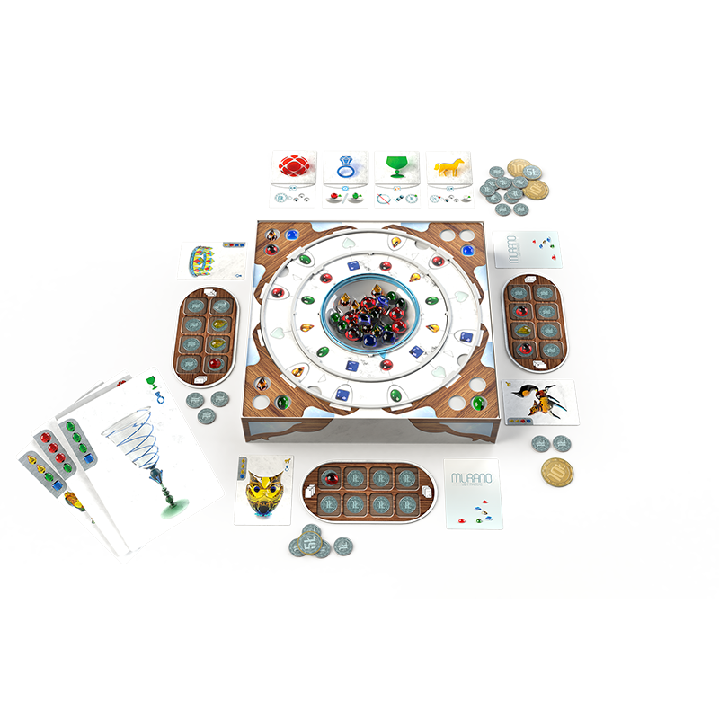 Comprend : un plateau de jeu, 1 anneau double-face, 4 plateaux individuels, 46 pièces de verre, 24 cartes illustrées, 16 cartes avantage, 4 tuiles catégorie, 65 jetons lecture, 1 marqueur premier joueur, 4 cartes d'aide au jeu.