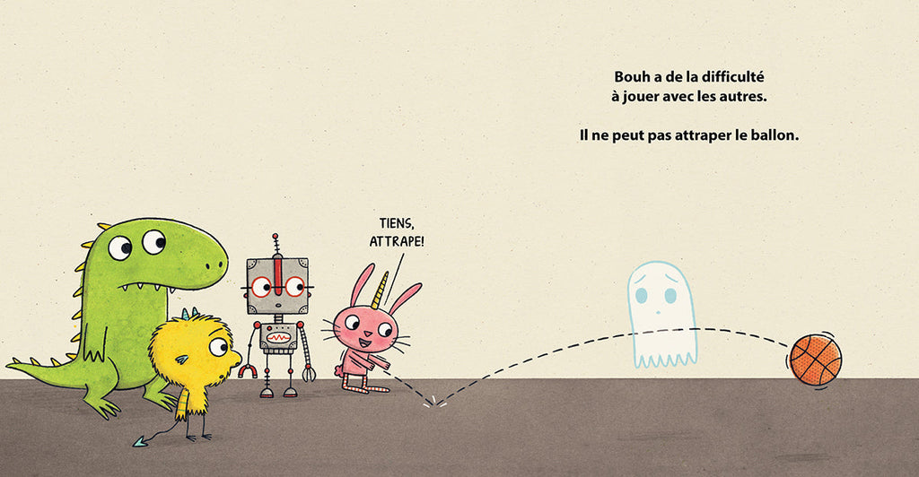 Bouh est le petit nouveau d’un groupe d’amis. Même si les autres enfants sont accueillants, être nouveau, ça peut parfois être effrayant… surtout pour un fantôme timide qui ne peut pas jouer à tous les jeux avec les autres. Bouh arrivera-t-il à s’intégrer au groupe et à se faire des amis?