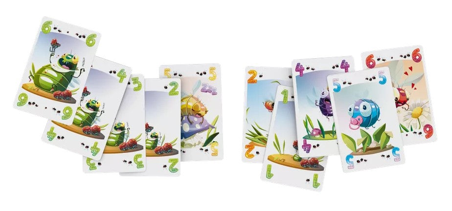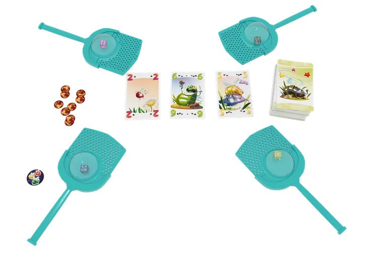 L'ensemble comprend : 5 tapettes à mouches, 11 jetons piège à mouches, 1 jeton premier joueur, 36 cartes mouches, des règles du jeu.