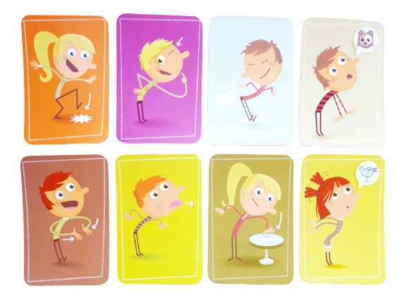 Le jeu comprend 32 cartes avec différentes actions (1 – taper dans les mains, 2 – siffler, 3 – faire un clin d’œil, 4 – imiter un pet, 5 – taper sur la table avec la main, 6 – tirer la langue, 7 – miauler, 8 – taper du pied au sol), ainsi qu’une notice avec les règles.